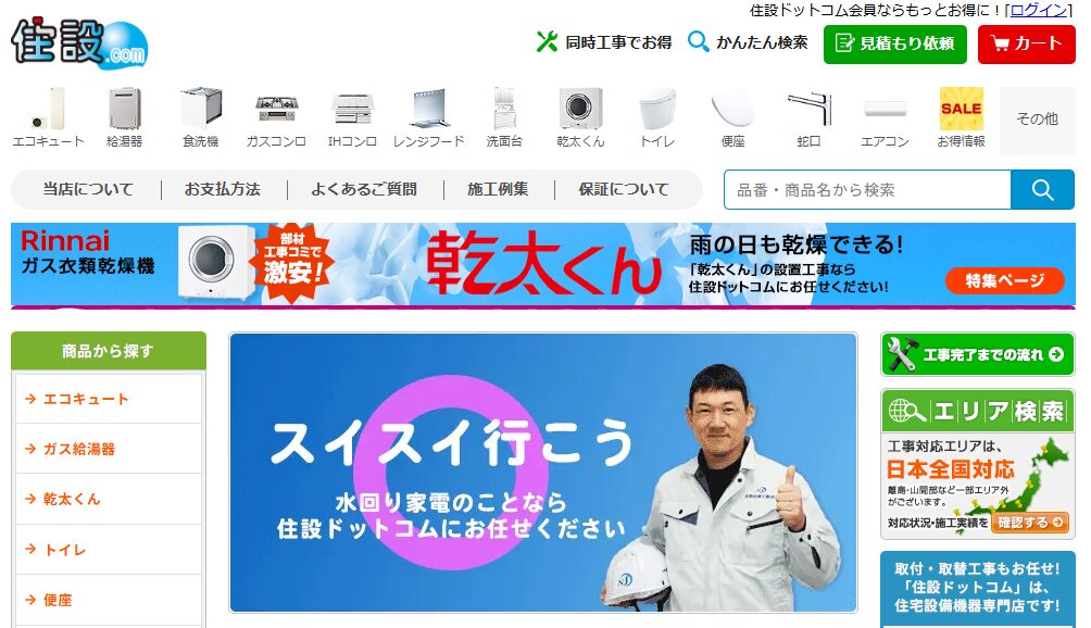 | 料金 | 給湯専用タイプ16号:56,800円~(税込・本体+標準工事費込) 追い焚き機能付きやエコキュートも業界最大級最大92%OFFで提供 ※「給湯省エネ2025」などの補助金申請にも対応 支払い方法 現金・クレジットカード(主要ブランド対応) |