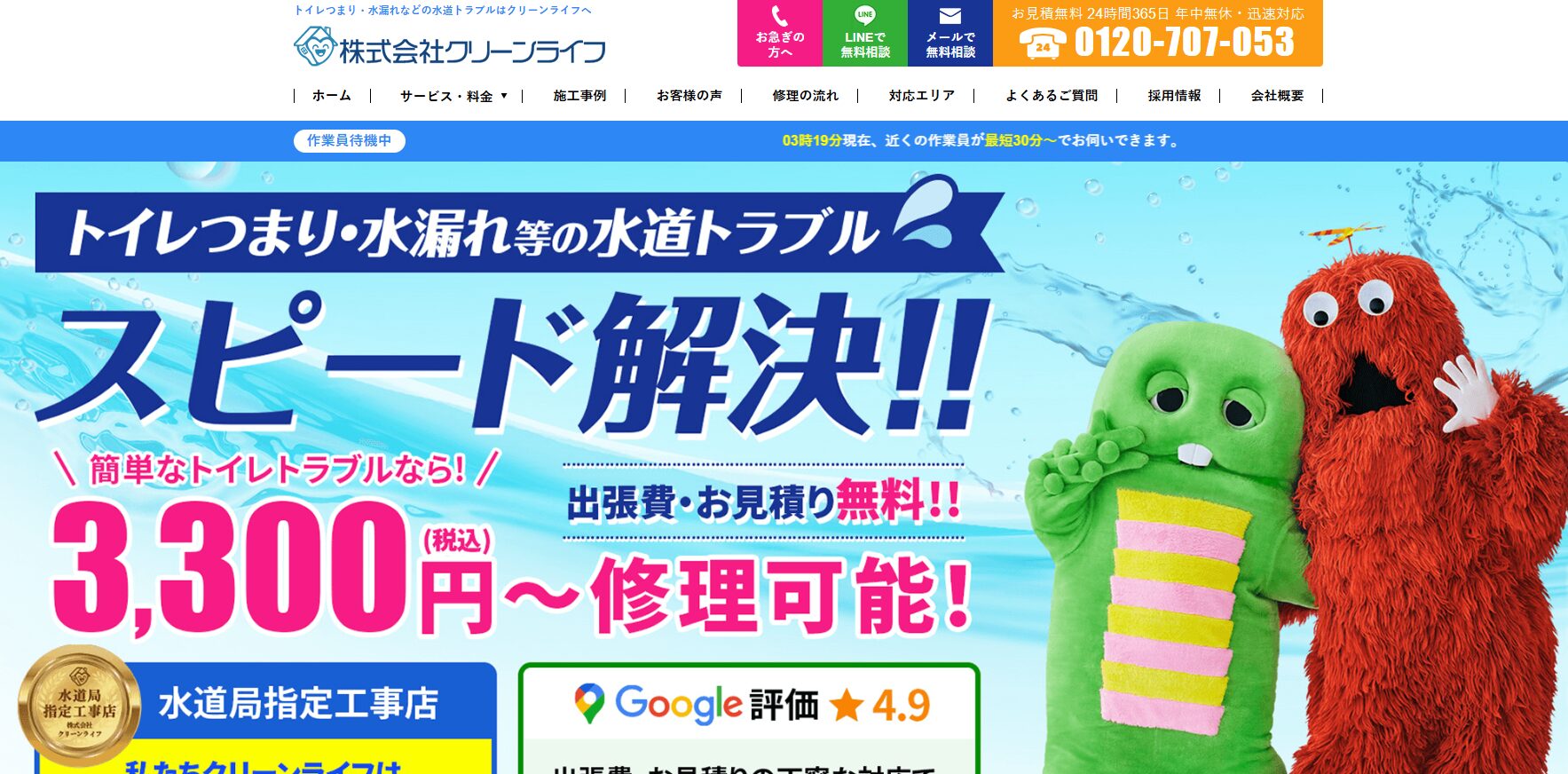 Googleでの口コミは5点満点中4.9と高評価で、迅速丁寧な対応や作業員の質の高さに定評があります。