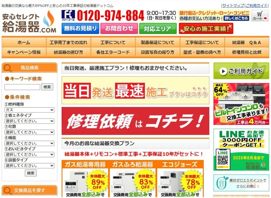 | 料金 | 給湯専用タイプ16号:56,800円~(税込・本体+標準工事費込) 追い焚き機能付きやエコキュートも業界最大級最大92%OFFで提供 ※「給湯省エネ2025」などの補助金申請にも対応 支払い方法 現金・クレジットカード(主要ブランド対応) |