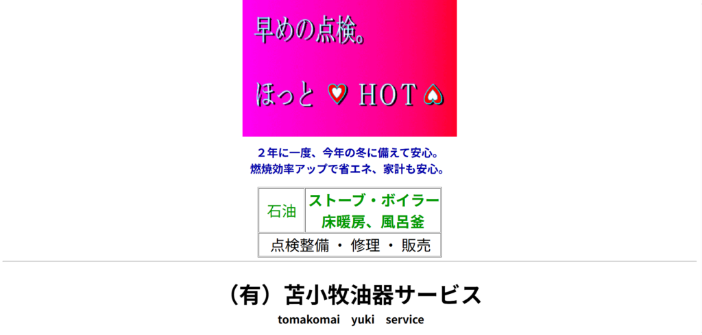 | サービス内容 | 暖房器具販売業者、ボイラー・ストーブの修理および交換。 |