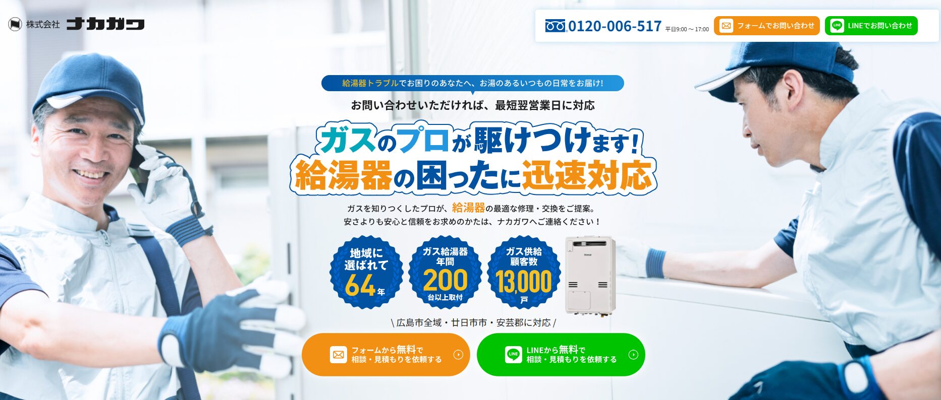 - 24時間365日受付、廿日市市の急な給湯器トラブルにもスピード対応(※在庫・交通状況・工事枠によります)