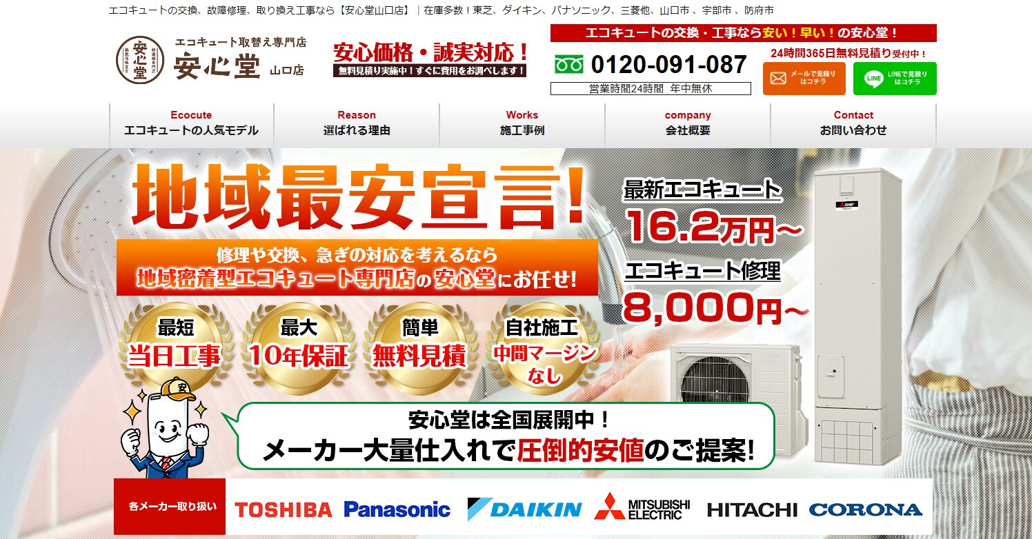 安心堂山口店は、エコキュートの交換工事に対応する専門店です。給湯器交換を検討するときも問い合わせ後に 現地調査と見積もり、工事という流れが決まっているので、初めてでも段取りをイメージしやすいです。 LINEやWebフォームから、現在使っている機種の型番が分かる写真や設置状況の画像を送れるようになっており、 設置条件を踏まえた見積もりを取りやすいです。申し込み前に型番と給湯器まわりの写真を用意しておくと、交換機種と費用が具体的にイメージできます。