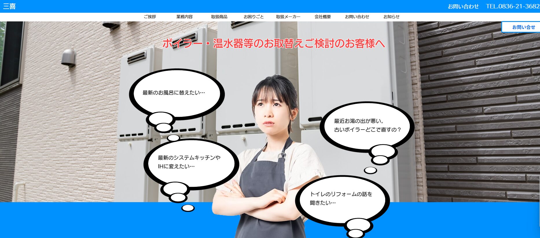 三喜は、ボイラー・給湯器やエコキュートの新設・交換・移設・修理まで任せられる業者です。給湯器交換や故障に悩んだ ときも、山口県内の業者として各種給湯器の施工やメンテナンス出張修理まで相談できます。問い合わせの際にお湯の症状や型番、設置場所の様子を伝えると、修理か交換かの判断材料が揃います。長府やノーリツ、LIXILなど複数の取扱メーカーがあり自宅の給湯設備に合った機種を検討しやすい体制です。