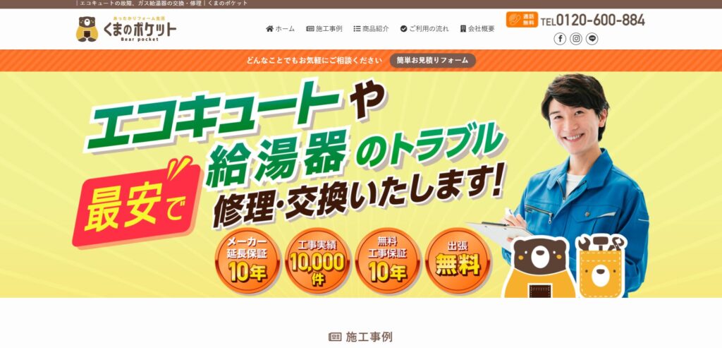 年中無休24時間体制で申し込みを受け付けているので、エコキュートの急な故障時に頼れる業者です。