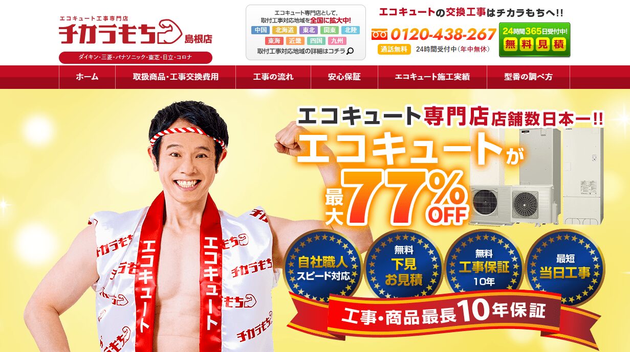 チカラもち島根店は、エコキュート交換工事専門店として全国に拠点を持つ窓口です。給湯器交換でも、見積もりや下見が無料のため、急な故障でも工事までの流れと費用感を早めに整理できます。申し込み前に設置中の機種の型番と周りの写真をそろえておくと、工事内容や総額のイメージがより具体的になります