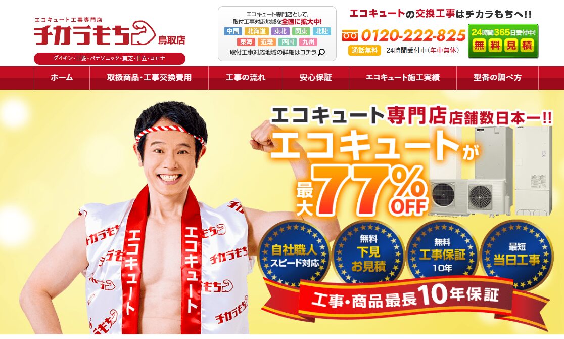 筑西市で給湯器交換を検討しているなら、キンライサーは全国対応の専門業者として比較候補に入れやすい一社です。WEB割引を活用した最大80%OFFの本体価格(機種・条件による)を打ち出しており、自社施工ならではの追加費用の出にくい総額提示を目指しているのが特徴です。工事前に「合計いくらになるか」と「どんな場合に追加料金が発生するか」を確認しておけば、見積り後に金額がふくらむ不安を抑えやすくなります。工事と商品に10年W保証がつくプランも用意されているため、筑西市で長く安心して使える給湯器を選びたい人に向いています。
