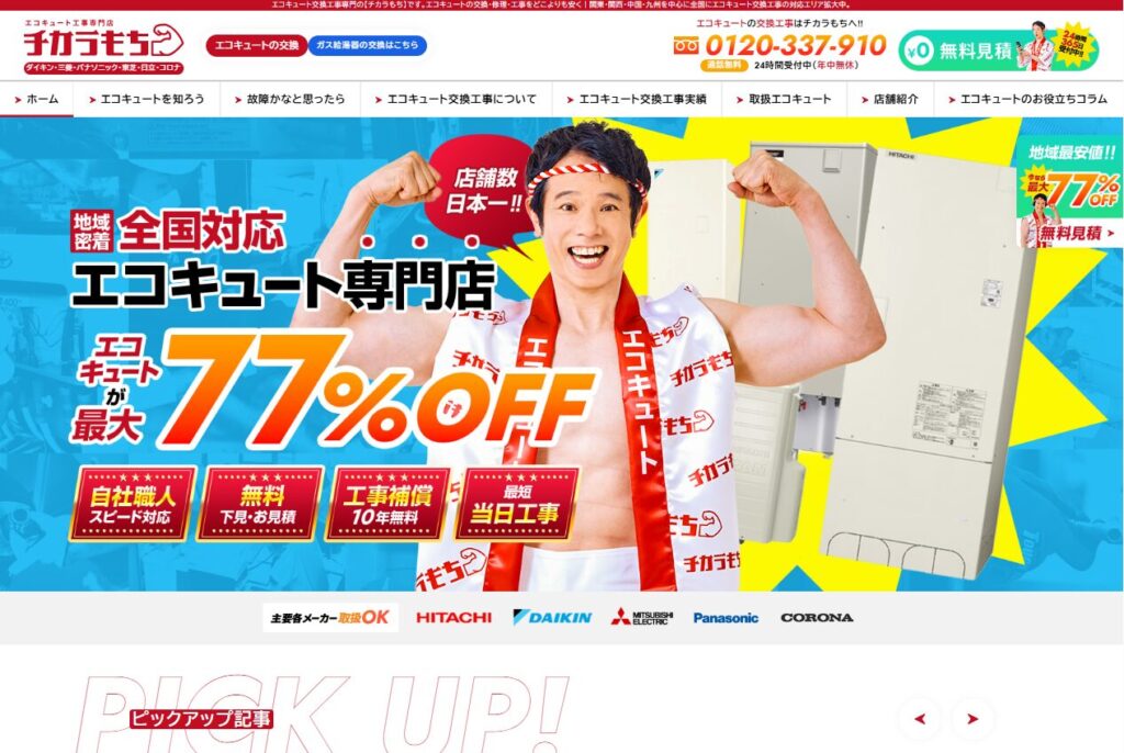 ちからもちは、東京都世田谷区に二店舗擁している、全国展開のエコキュート交換専門業者です。最短当日工事が可能で、自社職人による施工なので安心感があります。
