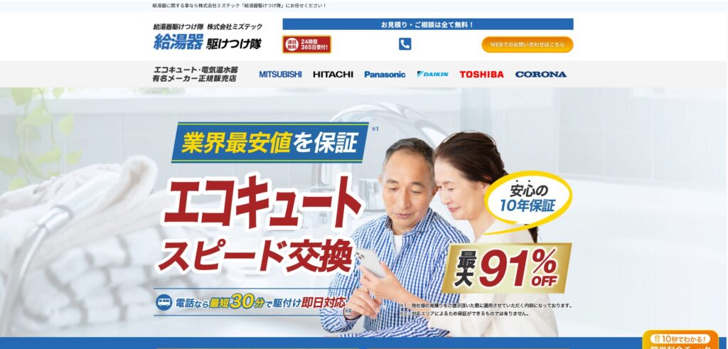 年中無休24時間体制で申し込みを受け付けているので、エコキュートの急な故障時に頼れる業者です。