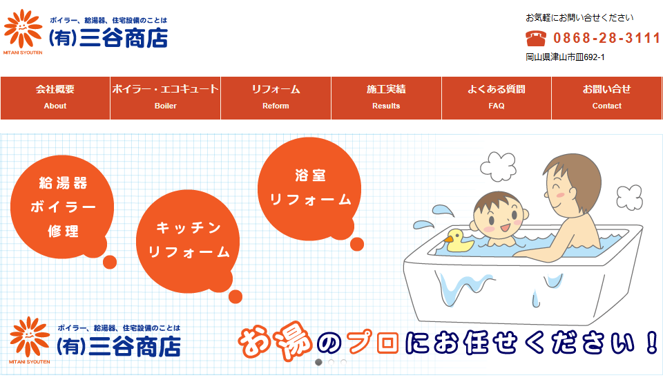 有限会社三谷商店は、給湯器・エコキュートの修理・取付に対応する窓口です。給湯器で修理可否を判断したい場合、機種が古い場合メーカーの部品生産終了により修理できない旨を公式で案内しています。お問い合わせフォームで氏名・電話番号・相談内容を入力して送れるため、確認事項が整理された状態で相談が進みます。給湯器選び方ガイドも用意しているので、交換候補を絞って相談できます。
