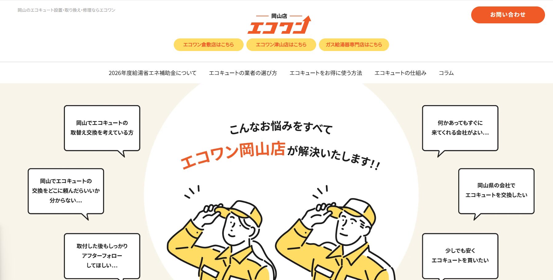エコワン岡山店は、給湯器・エコキュート交換に対応する専門窓口です。給湯器交換で機種選びの判断材料として、国内主要メーカーを含む計14社に対応と案内されています。問い合わせフォームではお名前・電話番号・住所・メールアドレスなどの入力項目が明記され、連絡の行き違いを減らせます。工事後は利用者と一緒に確認し、問題がなければ支払いとなる流れが示されています。