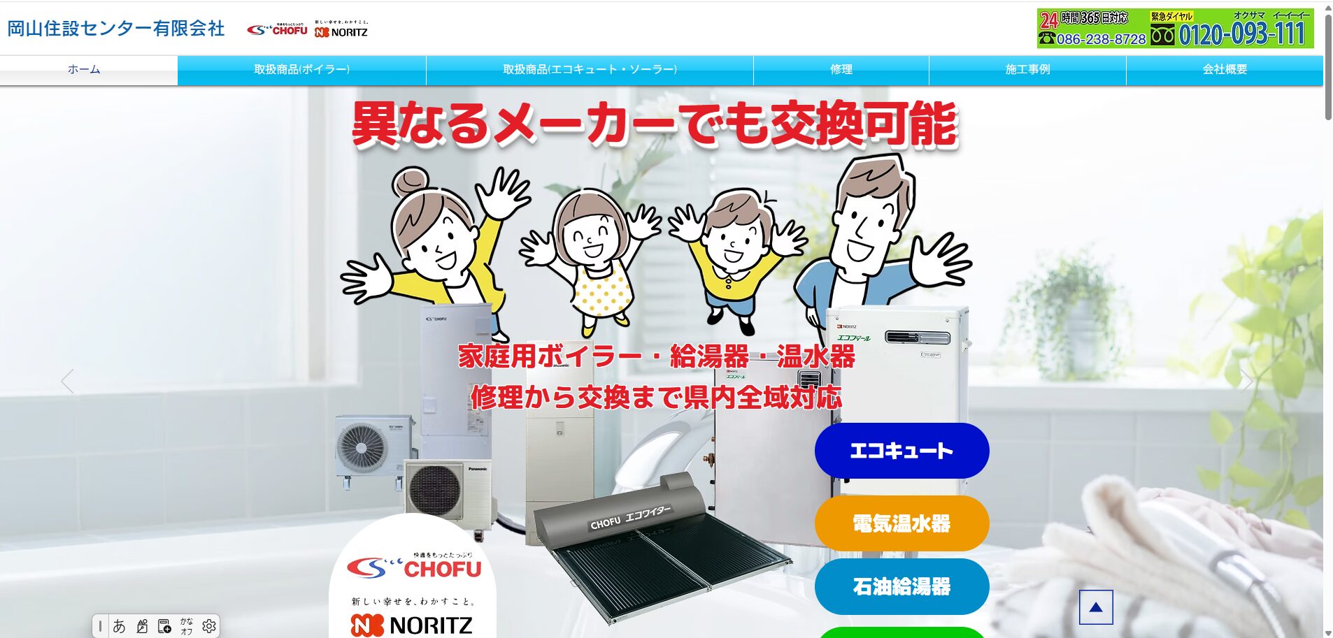 岡山住設センター有限会社は、給湯器・エコキュート交換に対応する窓口です。給湯器交換で不安になりやすい見積後に費用が増えるかは、正式なお見積り後の追加請求はなしと案内されています。申込み前に無料現地調査と見積り作成までの流れが用意され、判断に必要な金額根拠を先に固められます。また、全メーカー全タイプ取扱いの案内があるため、機種選びも一括で相談できます。