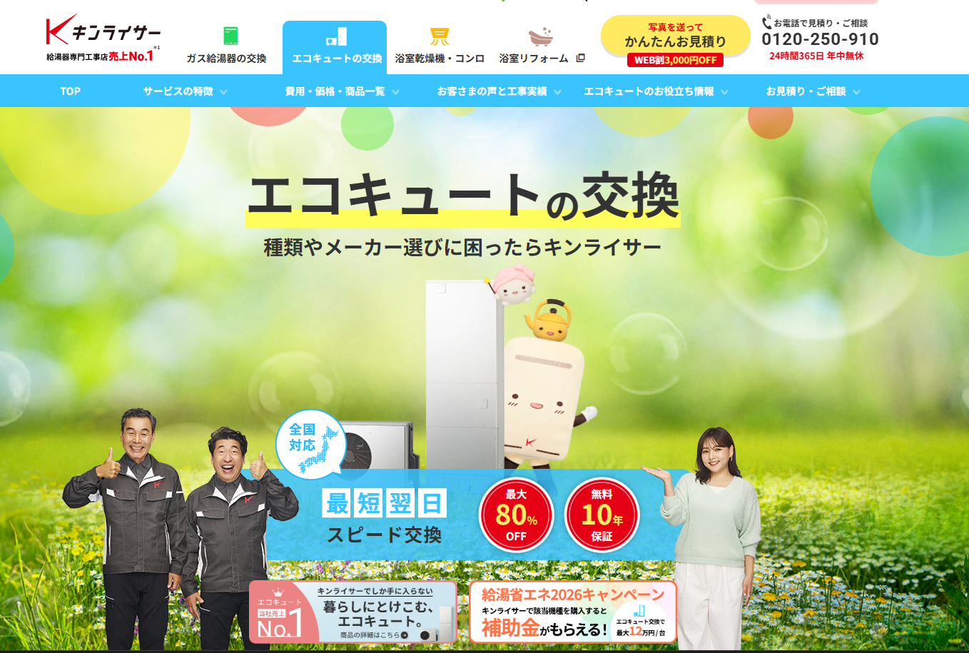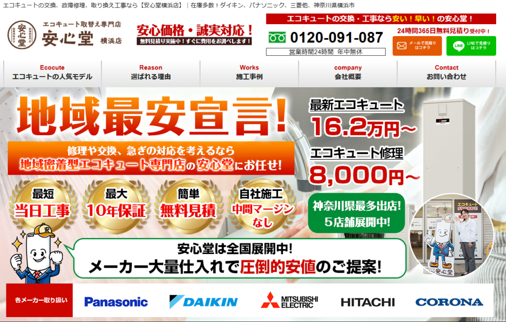 年中無休24時間体制で申し込みを受け付けているので、エコキュートの急な故障時に頼れる業者です。