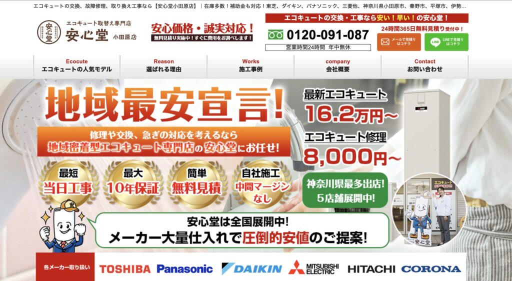 年中無休24時間体制で申し込みを受け付けているので、エコキュートの急な故障時に頼れる業者です。