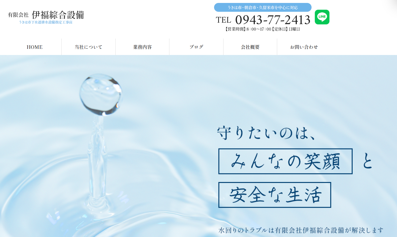 有限会社伊福総合設備住所:〒839-1407 福岡県うきは市浮羽町三春2525-5受付時間:8:00~17:00(定休日:日曜日)公式サイトはこちら