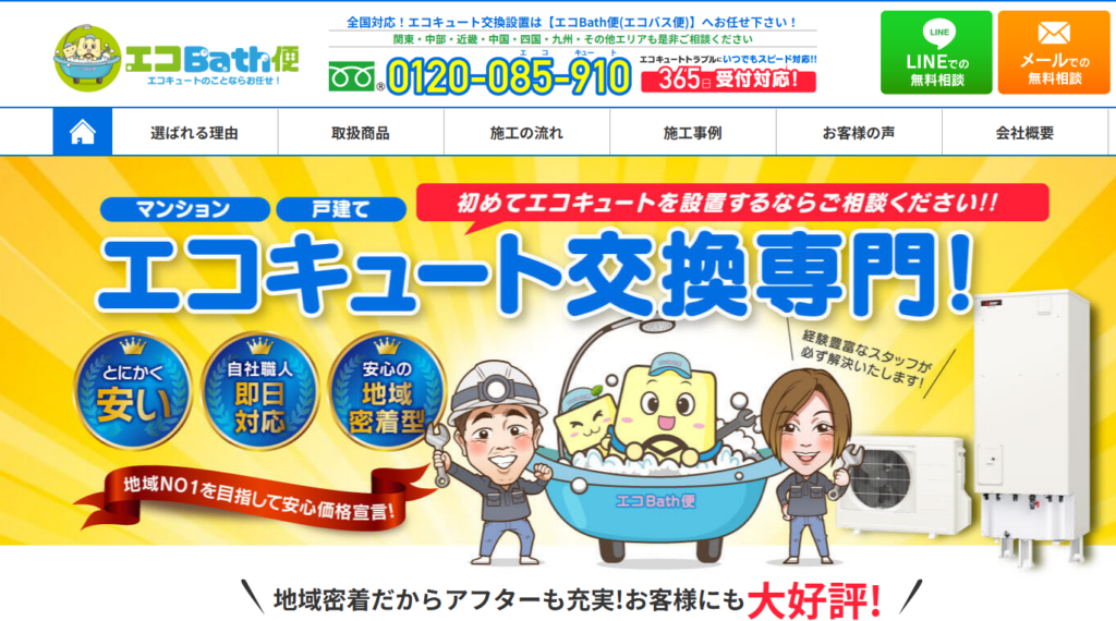 年中無休24時間体制で申し込みを受け付けているので、エコキュートの急な故障時に頼れる業者です。