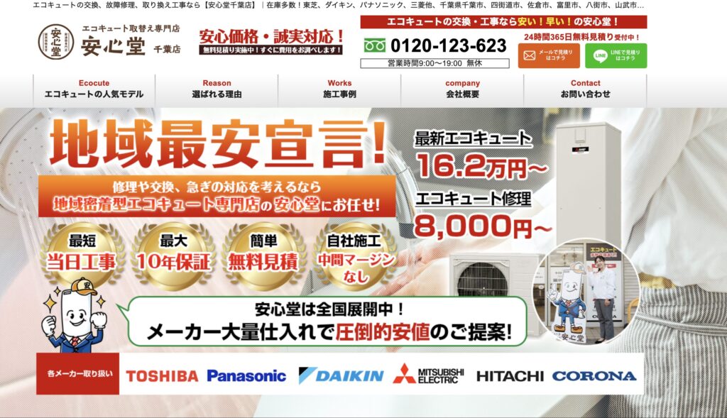 年中無休24時間体制で申し込みを受け付けているので、エコキュートの急な故障時に頼れる業者です。