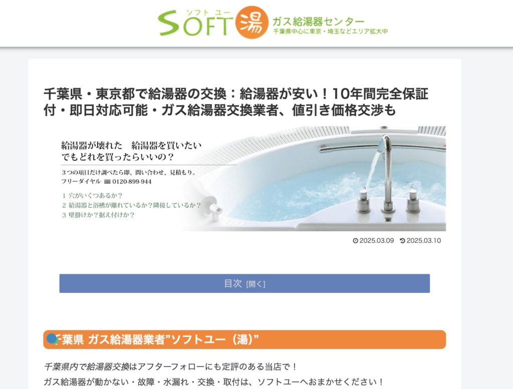 | 運営会社 | 千葉ガス給湯器 ソフトユー 千葉県市川市富浜3丁目14−11 クレセントゴールド |