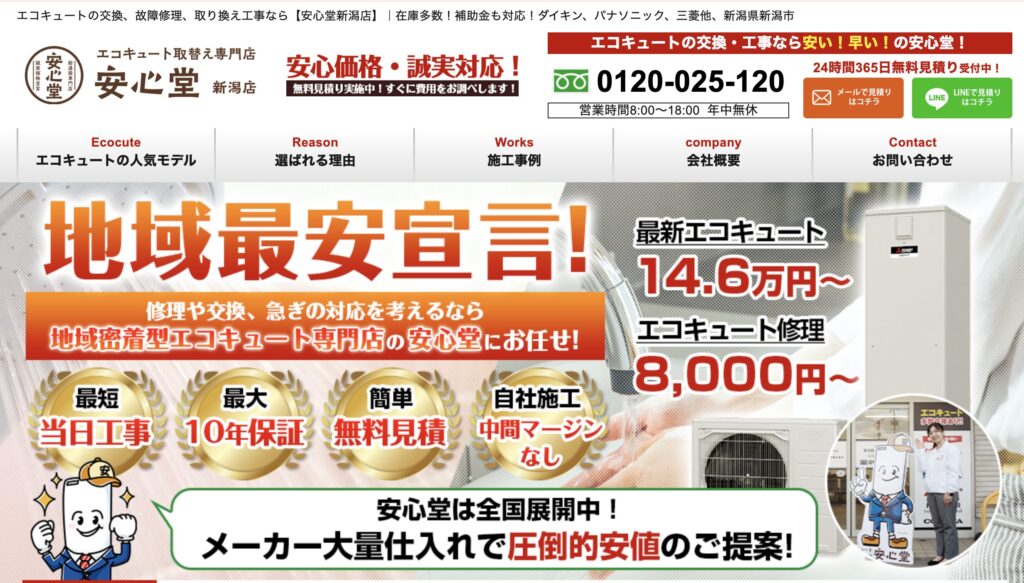| 運営会社 | エコキュート専門店 安心堂新潟店 新潟県新潟市山二ツ1丁目8−6 |