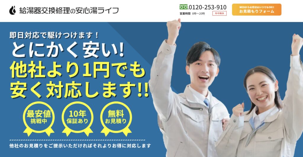 年中無休・最短即日30分で駆け付けてもらえるので、申し込みの時間帯によっては、その日のうちにお湯が使えるようになります。