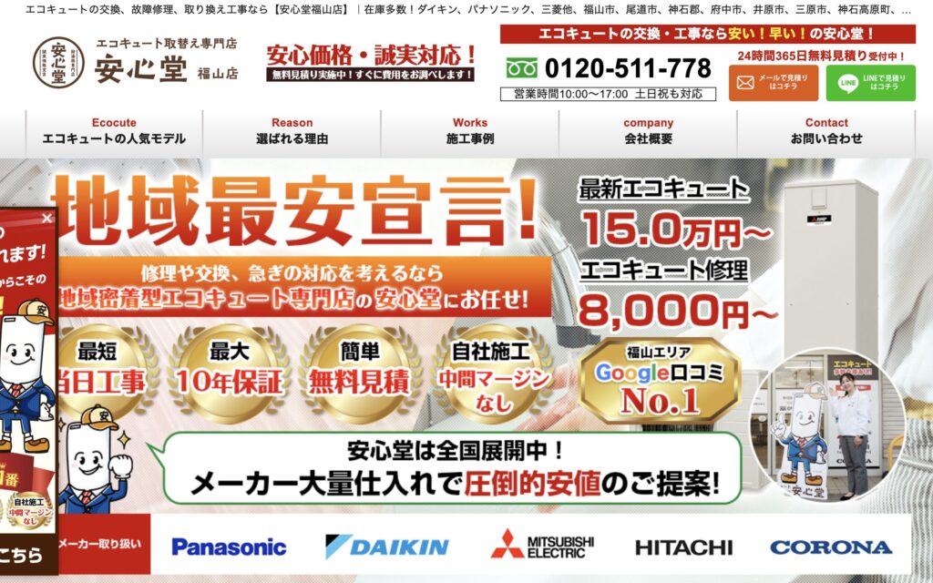| 運営会社 | エコキュート取替専門店 安心堂 福山店 広島県福山市神辺町新道上 2丁目10-10 |