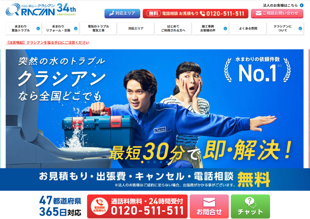 365日24時間受付で緊急時も即駆けつけ可能。見積もりは無料で、PayPayやローン払いなど柔軟な決済に対応しています。