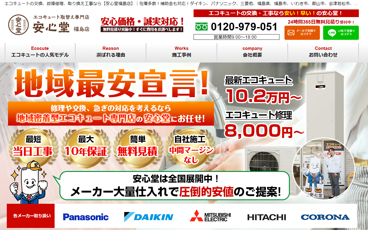 | 運営会社 | エコキュート専門店 安心堂福島店 福島県須賀川市 木之崎西田30 |