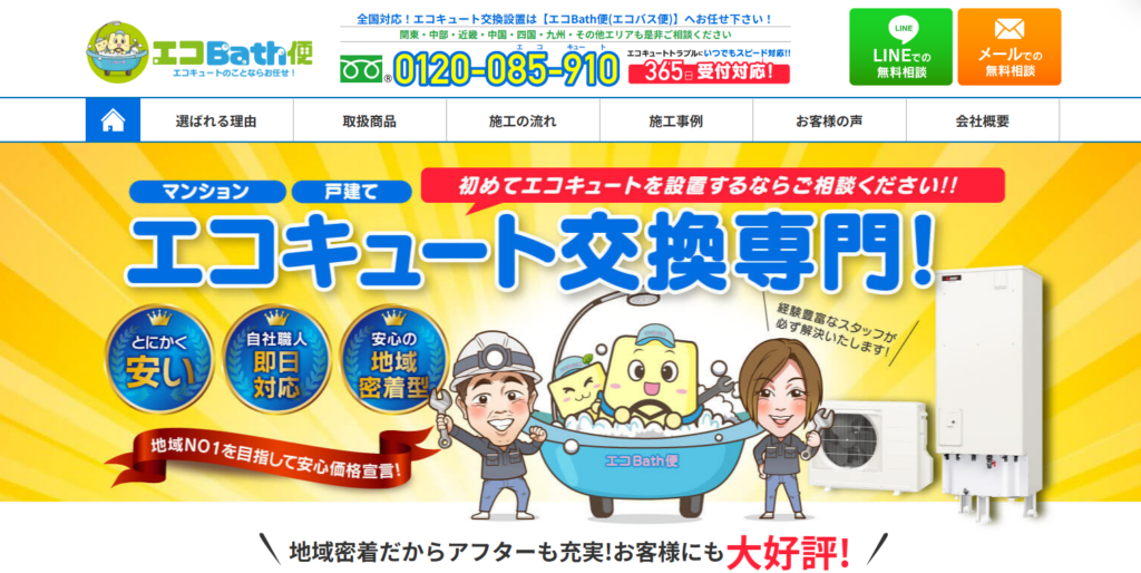 年中無休24時間体制で申し込みを受け付けているので、エコキュートの急な故障時に頼れる業者です。