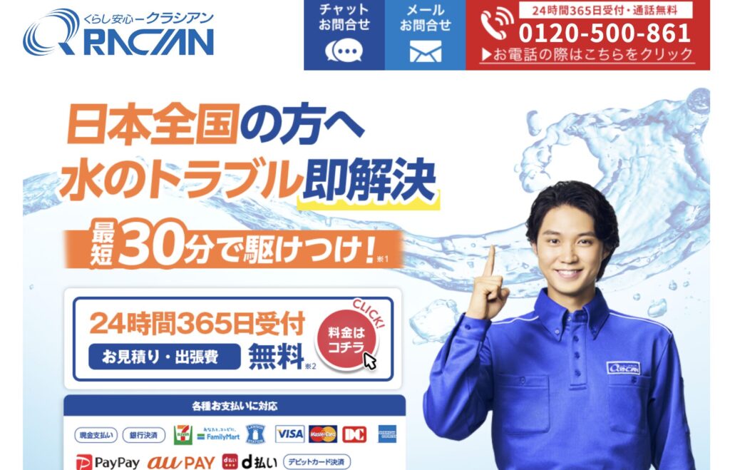 365日24時間受付で緊急時も即駆けつけ可能。見積もりは無料で、PayPayやローン払いなど柔軟な決済に対応しています。