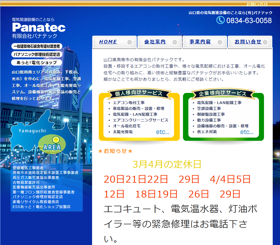 | サービス内容 | 電器店、給湯設備機器の販売・交換。 |