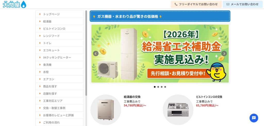| 料金 | 給湯専用タイプ16号:56,800円~(税込・本体+標準工事費込) 追い焚き機能付きやエコキュートも業界最大級最大92%OFFで提供 ※「給湯省エネ2026」などの補助金申請にも対応 支払い方法 現金・クレジットカード(主要ブランド対応) |