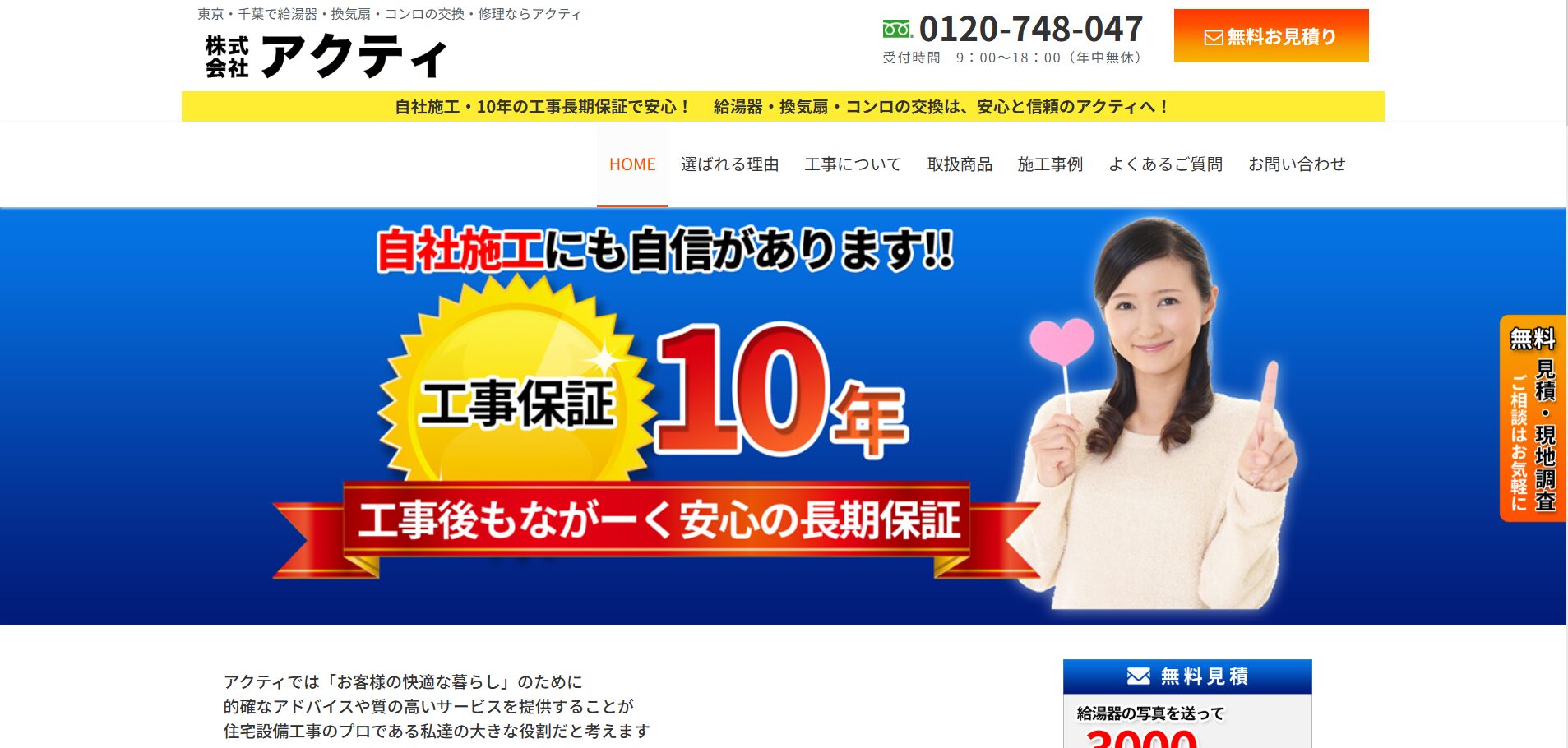 - 最短駆けつけ&当日工事対応や10年保証クラスのアフターサポート(※公式要確認)が心強い